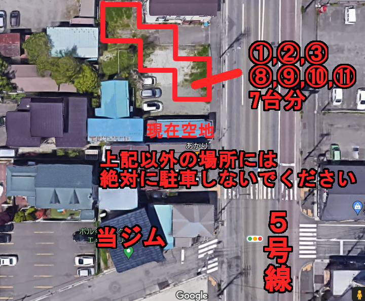 国道5号線沿い駐車場 (①~③、⑧~⑪:7台分) がジムの契約駐車場です(上図参照)